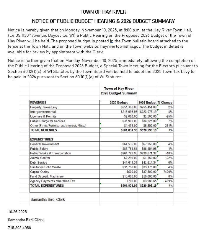 Posted on October 26, 2025, Edited October 26, 2025 by clerk Notice: 2026 Budget Hearing & Special Meeting of Electors